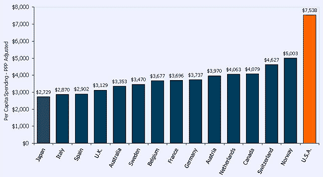 We in the United States spend more than any other country on healthcare per captia by quite some margin. As of 2008, estimates by the Organisation for Economic Co-operation and Development (OECD) found that, after adjustments for currency and purchasing power parity, the US spent on average US$7538 per capita on healthcare. Compare that to the next highest level of spending per capita, found in Norway, at US$5003. Despite this spending, the US is just about equal to Cuba in terms of adult life expectancy (78.3 years overall for both countries). Yet, in Cuba, a mere US$260 per capita was spent in 2005 to the US$6543 spent in the US that same year.