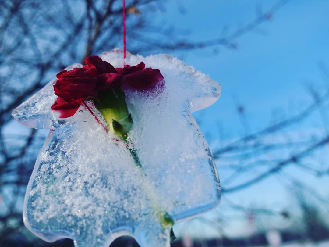 This ice ornament tree popped up more than a week ago, I think. Whilst out on a run, I spied a woman hanging ice ornaments in various shapes and sizes and colours on a completely bare tree. Those shapes and colours and ice-encased objects have increased seemingly exponentially since then to cover every branch within reach on one specific tree. Some are simply ice, whilst others have been coloured various shades and hues. Flowers such as tulips and carnations and roses along with twigs of pine and eucalyptus are also encased in ice. As a knitter, I was thrilled yesterday to discover that some bits of yarn have also now appeared. Each day, other passers-by stop and admire the ice ornaments and snap pictures of the tree, individual items and themselves with the tree. And, they smile. They stand and admire and smile. Those smiles are welcome. If I’m completely honest, I’ve redrawn my running map so that I can pass this specific tree every day now. It’s really just that lovely, regardless of weather and regardless of the presence or absence of sunshine.