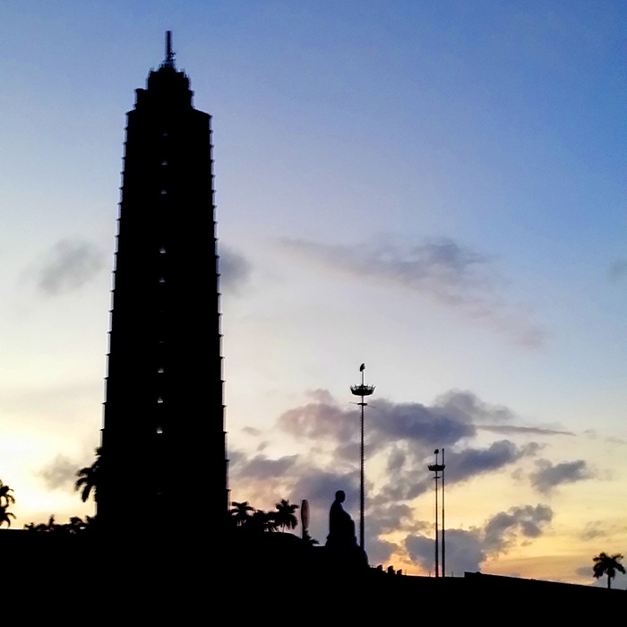 A view of a monument to Cuban hero and poet José Martí and Revolution Square at dusk. Havana, Cuba, January 2015
